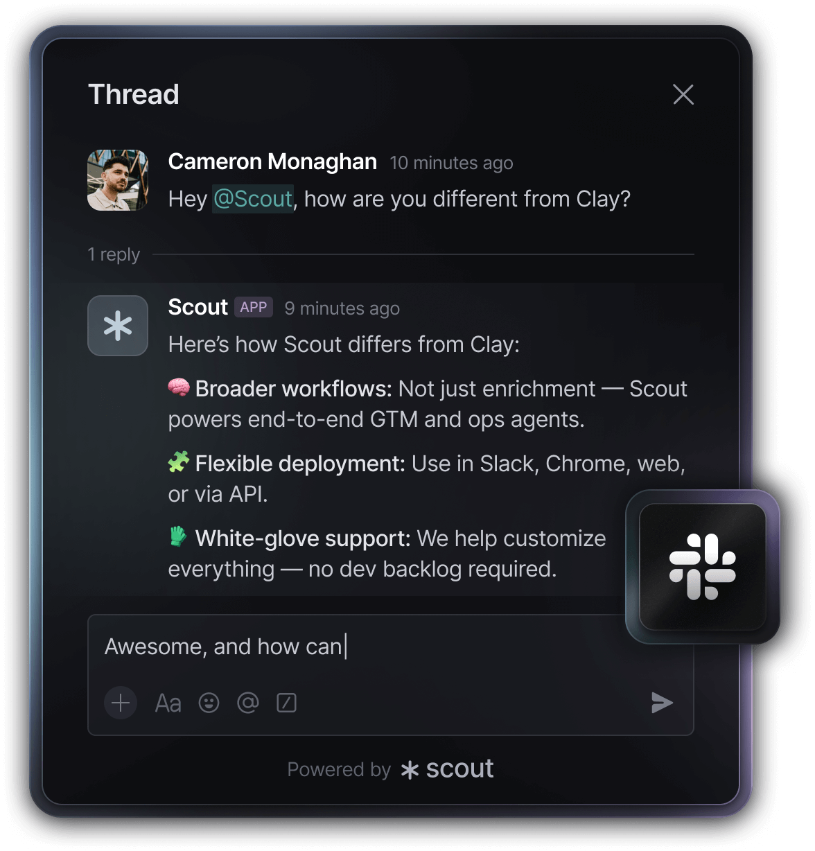 Let Scout handle the tech lift. We connect to your data, build AI agents, then launch them into the tools you already use. Choose presets or go custom, all with white-glove support.